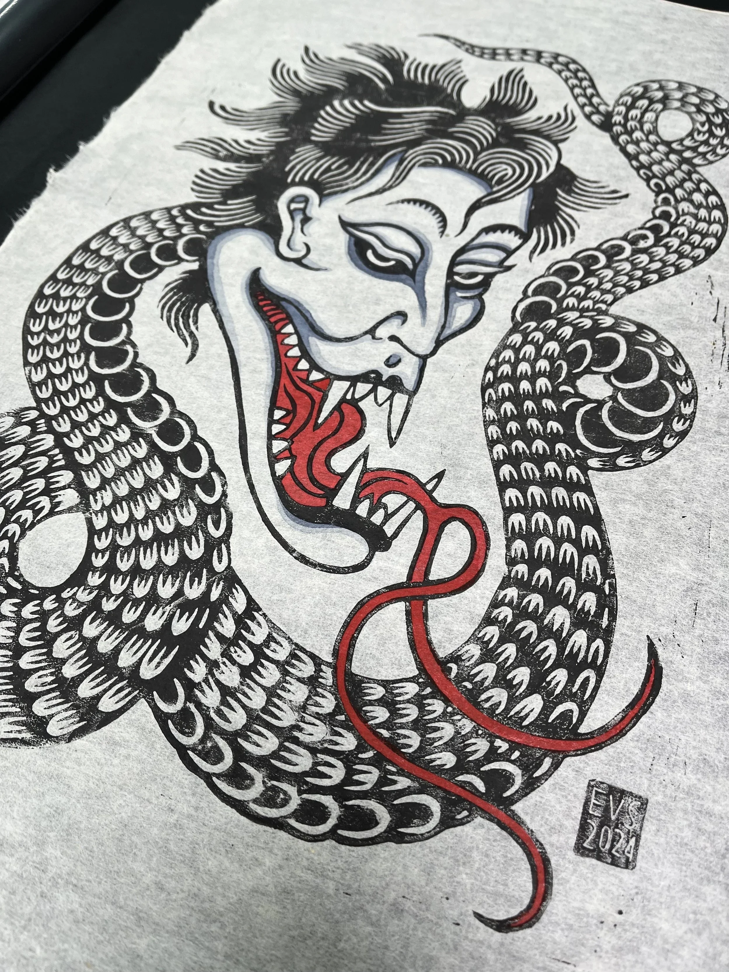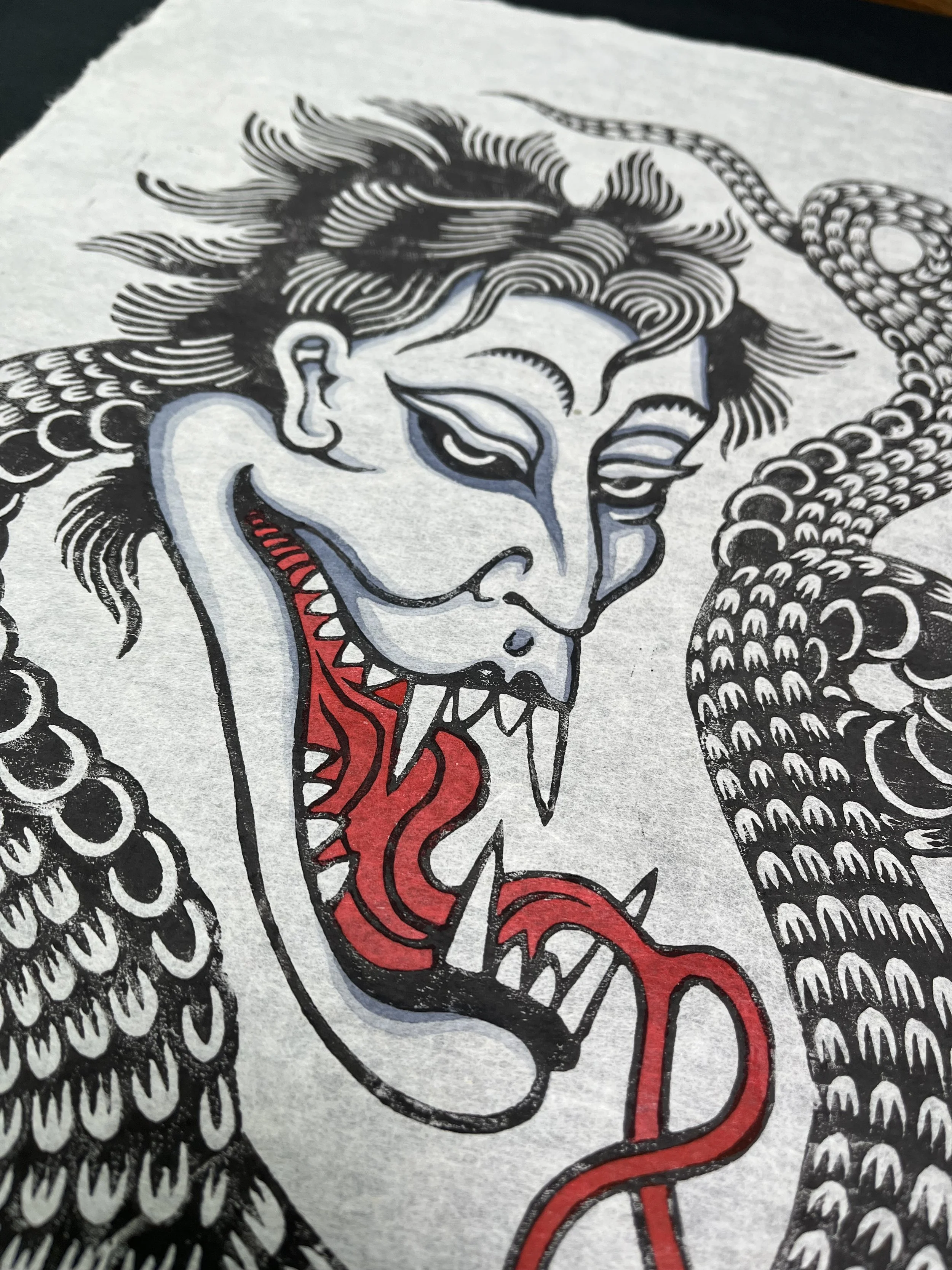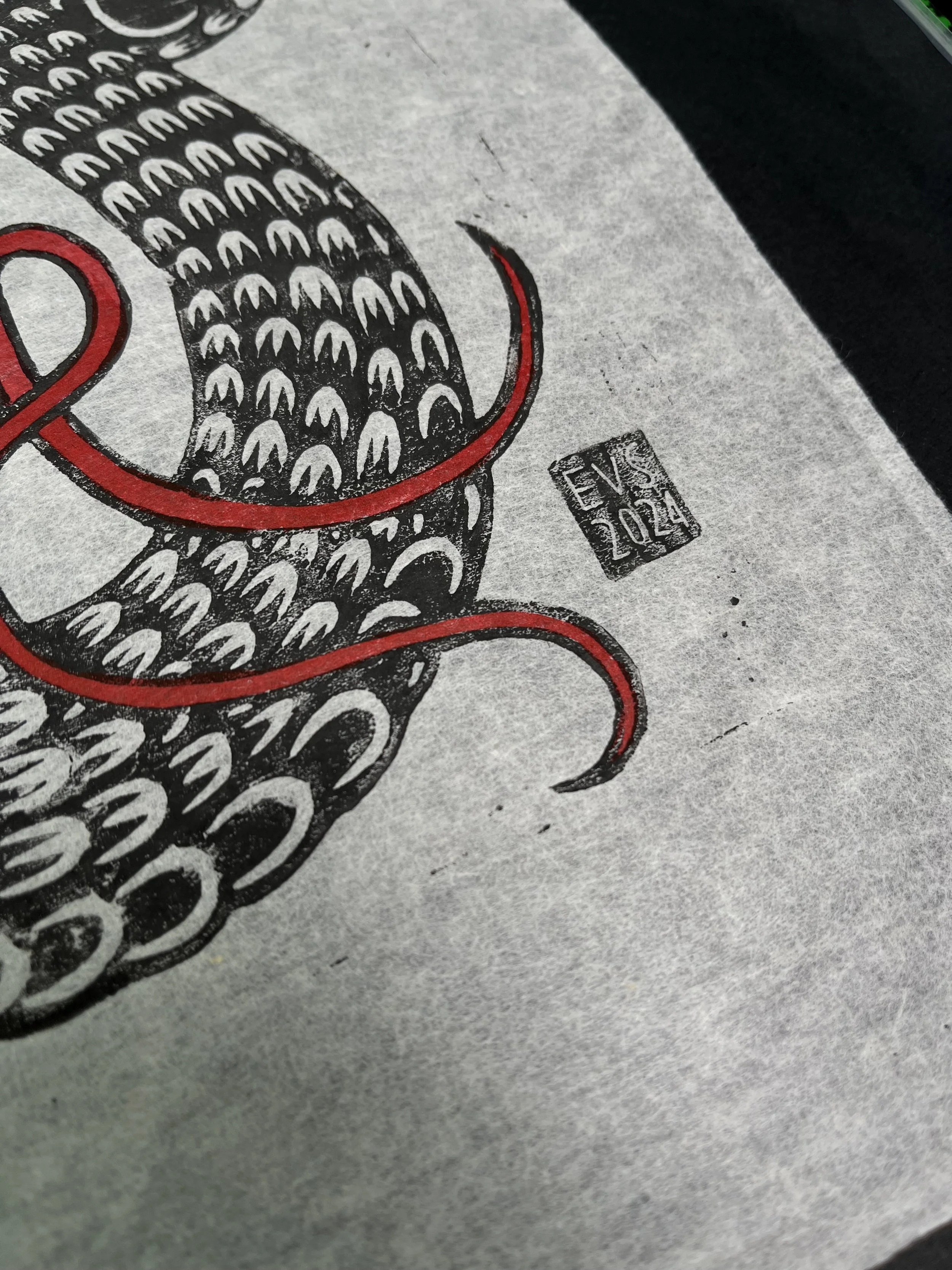 I designed the project directly on the linoleum block to have a rougher finish. Printed with water based ink and as a final step coloured some parts with ink.