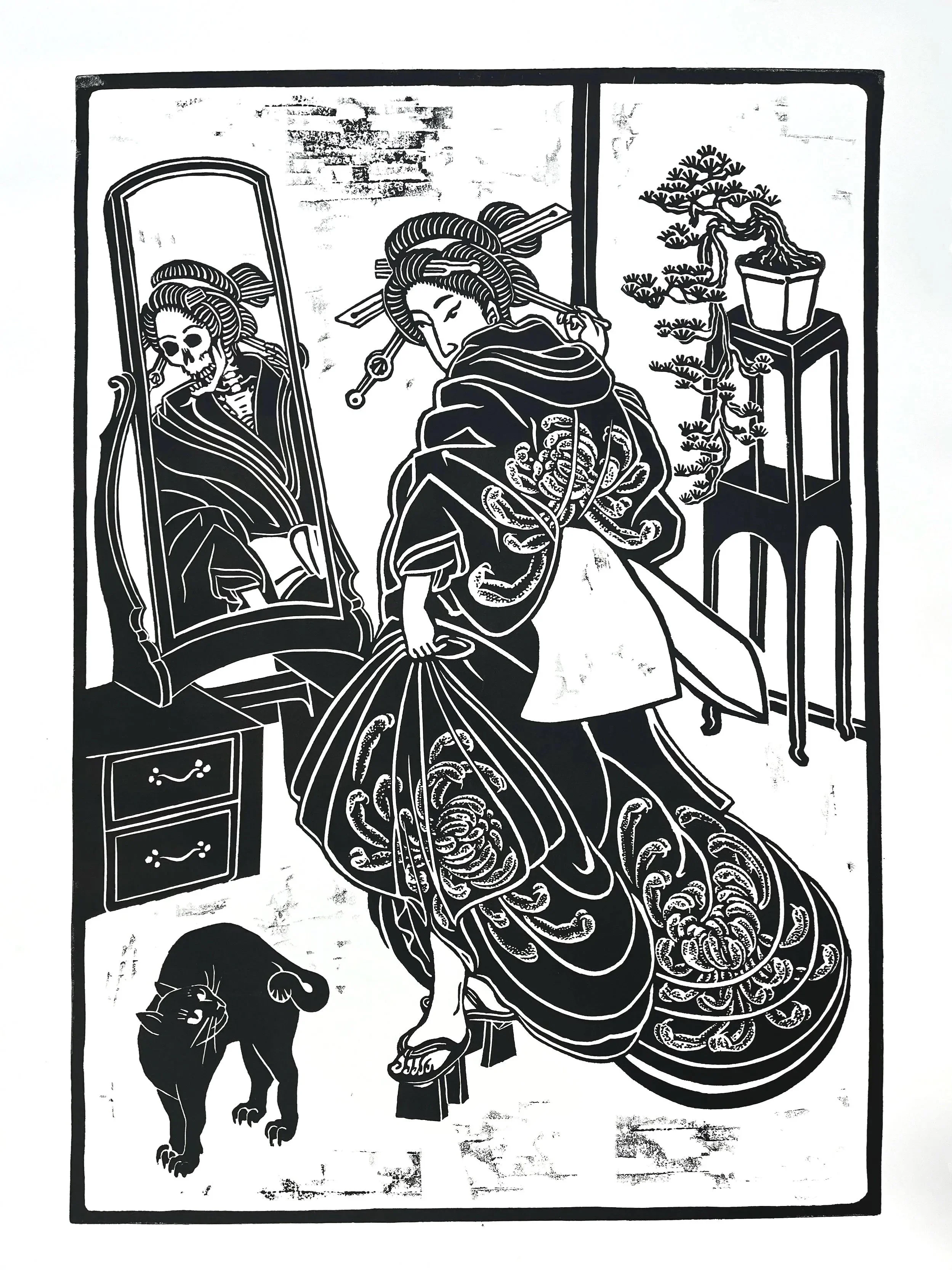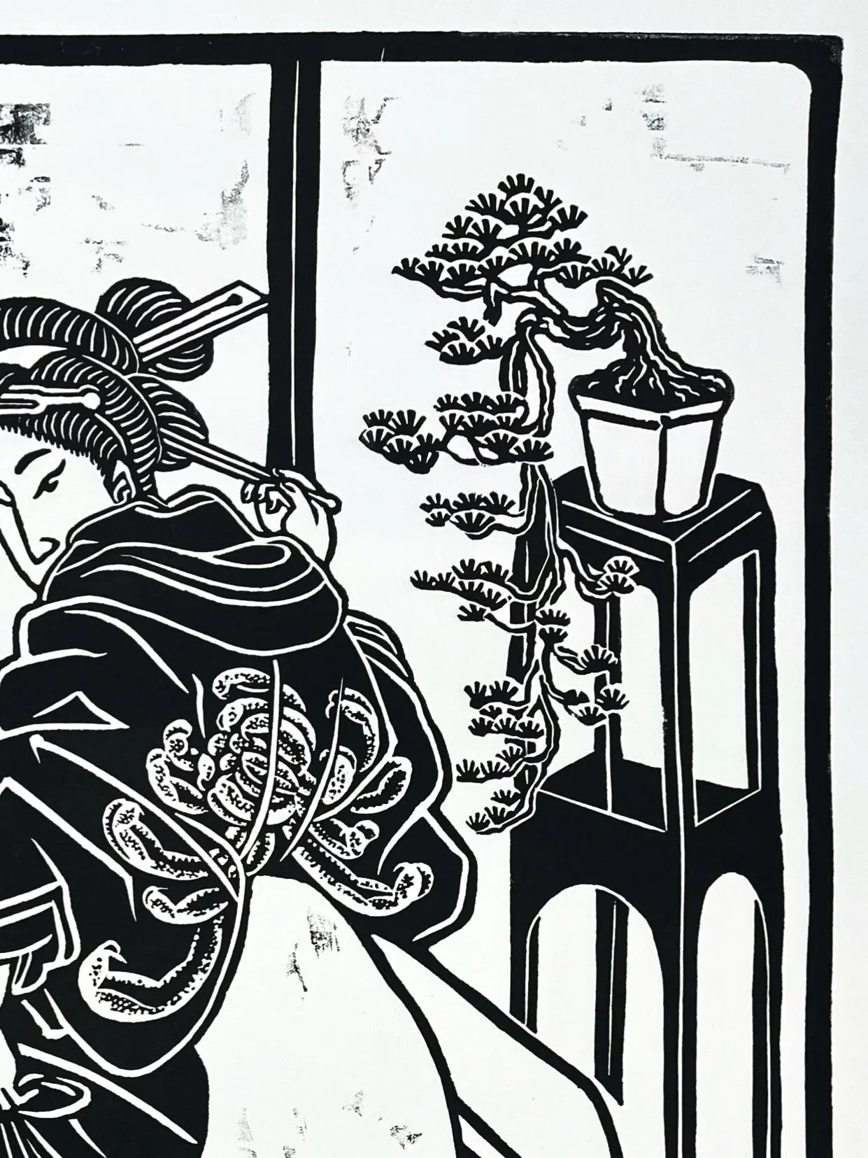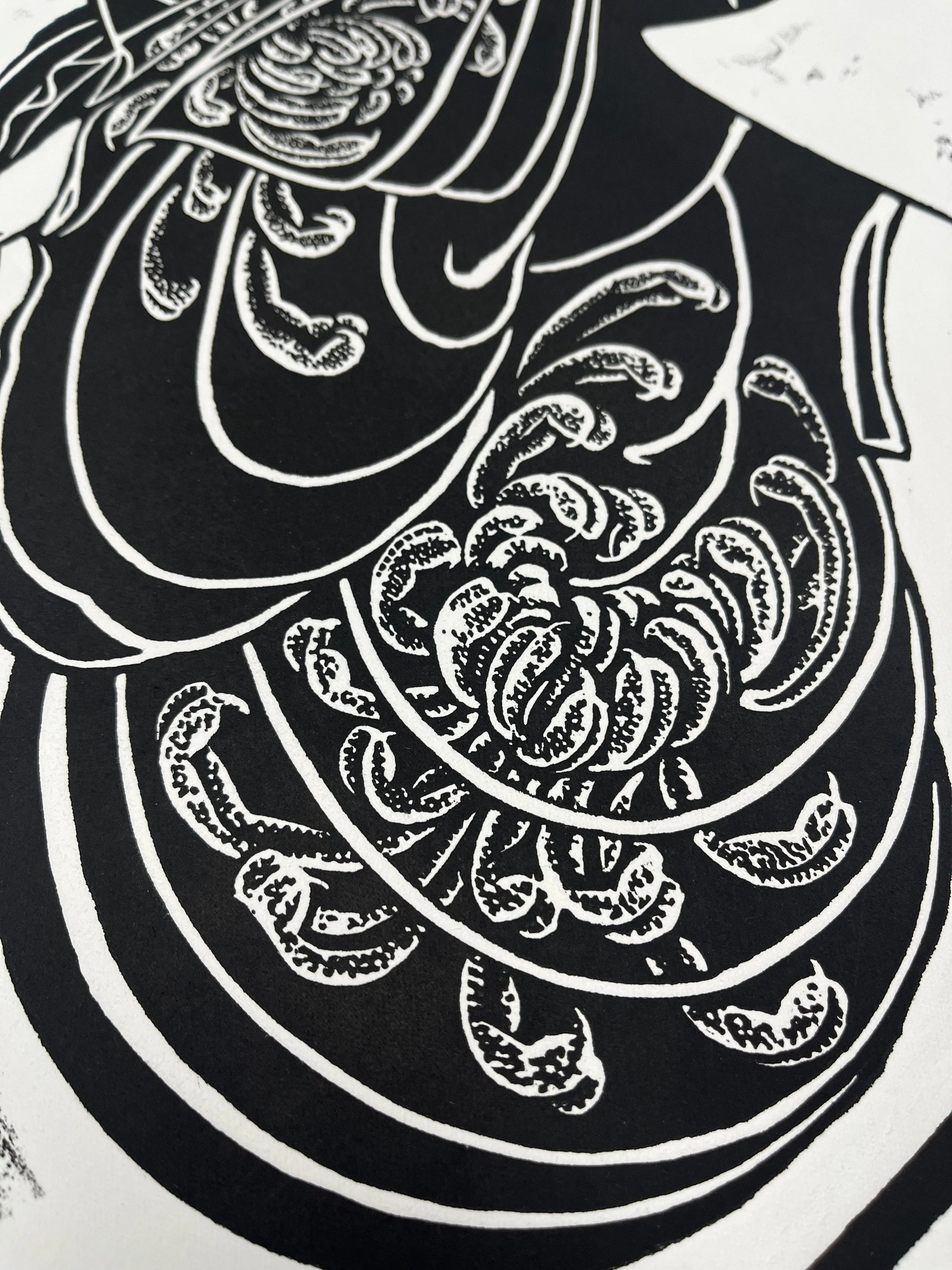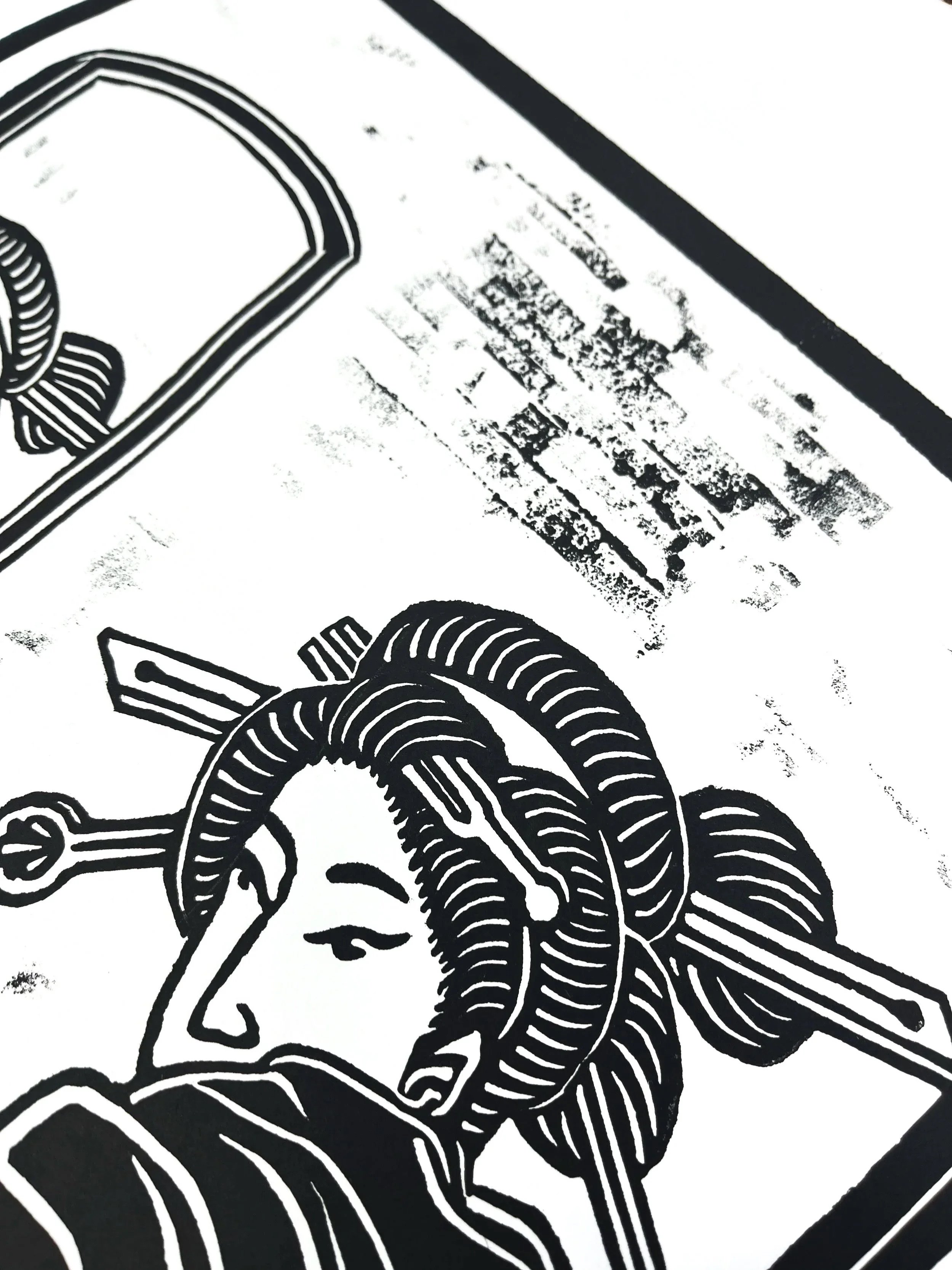 My second linocut project, I was still exploring contrast and tecniques, but still, Japanese art was always my main inspiration.